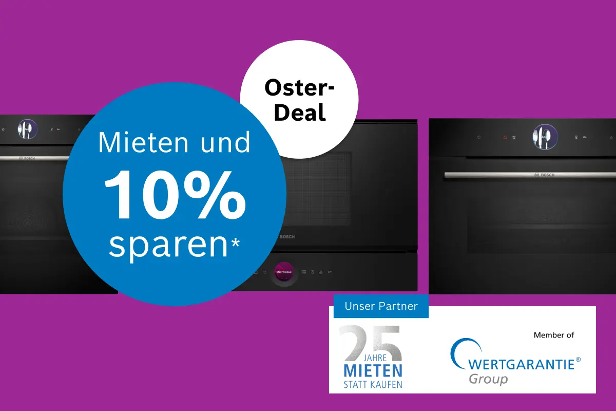 Alles drin für traumhafte Back- und Grillerlebnisse - ohne Stress und völlig sorgenfrei. Bei unserem Partner Mieten statt kaufen mietest du deinen Bosch Backofen oder die Mikrowelle zum monatlichen Festpreis, inklusive ausgezeichnetem Rundum-Service direkt vom Hersteller. Das heißt von Lieferung über Installation bis hin zu Reparaturen und Ersatz.