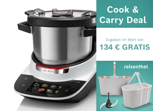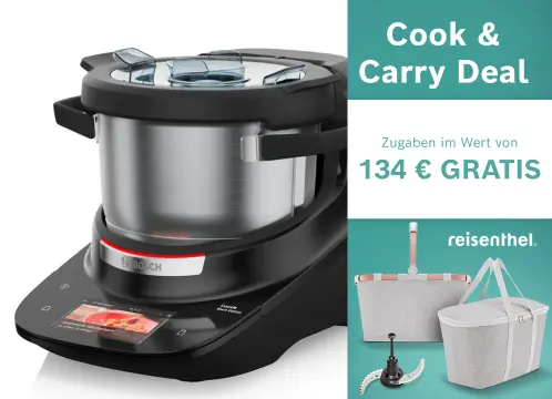 Das Angebot gilt nur bei Kauf eines Cookit (MCC9555DWC oder MCC9555DBC) im Aktionszeitraum vom 04.02.2026 – 17.03.2026 und nur solange der Vorrat reicht. Die Aktion (Zugabe 1x Crushmesser i.W.v. 34,99 € + 1x Reisenthel Set i.W.v 99,98 €) ist nicht mit anderen Aktionen (Gutscheinen, Rabatte o.ä.) kombinierbar. Der Wert der Gratiszugabe ergibt sich aus dem Einzelpreis der zum Einzelkauf unter www.cookit.de erwerbbaren Beigabe i.W.v. 134,97 €.