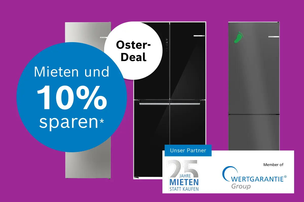 Alles drin für zuverlässiges Kühlen bei voller Flexibilität - ganz entspannt und völlig sorgenfrei. Bei unserem Partner Mieten statt kaufen, mietest du deine Bosch Kühl-Gefrierkombination zum monatlichen Festpreis, inklusive ausgezeichnetem Rundum-Service direkt vom Hersteller. Das heißt von Lieferung über Installation bis hin zu Reparaturen und Ersatz.