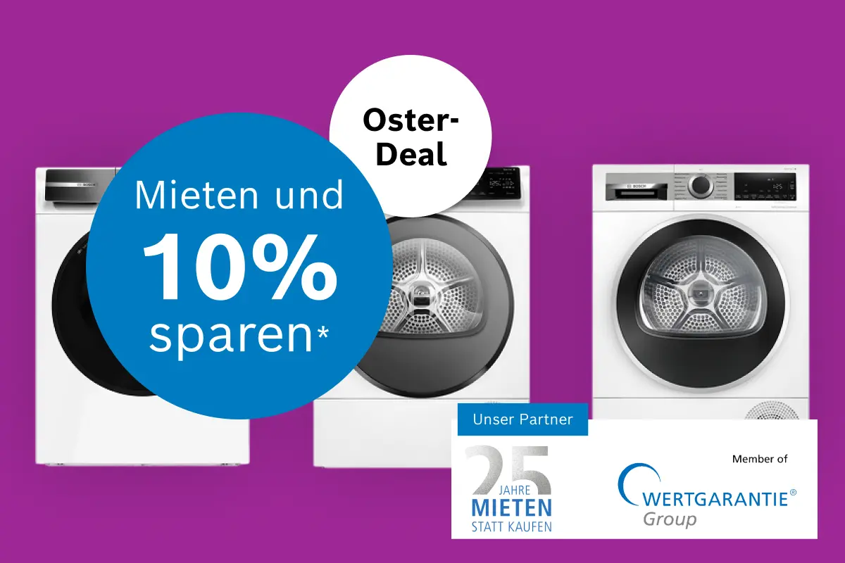 Alles drin für flauschige Wäsche und freie Zeit - ganz entspannt, völlig sorgenfrei. Bei unserem Partner Mieten statt kaufen, mietest du deinen Bosch Trockner zum monatlichen Festpreis, inklusive ausgezeichnetem Rundum-Service direkt vom Hersteller. Das heißt von Lieferung über Installation bis hin zu Reparaturen und Ersatz.