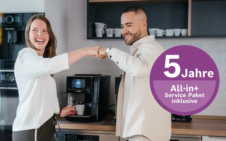 Büroküchen benötigen flexible Lösungen, wenn es um die Ausstattung mit Hausgeräten geht. Hier setzt Bosch All-in+ an. All-in+ kombiniert ausgezeichneten Full-Service und Premium Hausgeräte in einem exklusiven Paket. Das heißt inklusive Lieferung, Aufstellung und Installation bis hin zu Reparaturen oder Ersatz direkt von Bosch. Die Mietlaufzeiten betragen zwischen 36 und 60 Monate. Dein Bedarf ändert sich? Kein Problem, Vertrag und die Laufzeit können jederzeit flexibel angepasst werden.