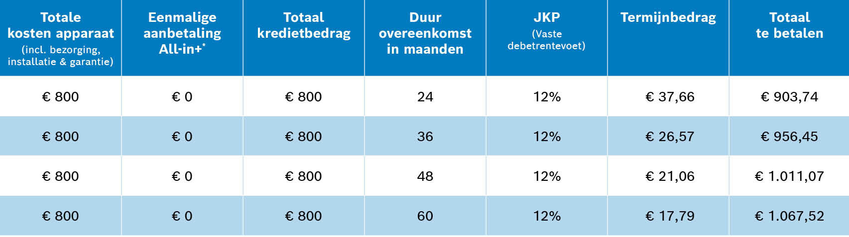 Het maandbedrag en de looptijd (maximaal 60 maanden) bepaal je zelf. Op basis van je keuze en de 12% rente over de restschuld ontstaat een vast maandbedrag. Geen verrassingen. Je weet vooraf precies wat je elke maand betaalt en hoe lang. Om je een idee te geven kun je hieronder een rekenvoorbeeld bekijken.