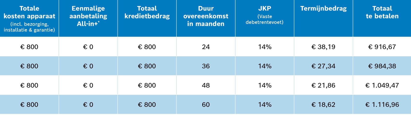 Het maandbedrag en de looptijd (maximaal 60 maanden) bepaal je zelf. Op basis van je keuze en de 14% rente over de restschuld ontstaat een vast maandbedrag. Geen verrassingen. Je weet vooraf precies wat je elke maand betaalt en hoe lang. Om je een idee te geven kun je hieronder een rekenvoorbeeld bekijken.